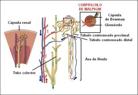 La cavidad de la cápsula de Bowman se continúa con un túbulo largo y de trayecto sinuoso, el túbulo contorneado proximal. Luego sigue el asa de Henle, que es un túbulo recto con forma de U donde se diferencia una rama descendente y otra ascendente, y por último el túbulo contorneado distal, que desemboca en el túbulo colector y adopta un trayecto similar al proximal. La función que tienen los túbulos renales es transportar la orina y transformar su composición química hasta los túbulos colectores. Este conducto colector es común a varios nefrones y es donde se produce la concentración final de la orina por acción, como se expondrá más adelante, de la hormona antidiurética.